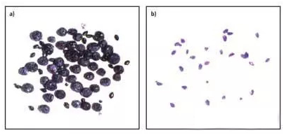 圖1:a)使用白色背光照明檢測藍莓中的金龜子,藍莓和金龜子可以同時被看到。b)使用紅外背光照明,紅外光可穿透藍莓,被金龜子吸收,因此即使是被藍莓遮住的金龜子也能被檢測出來。