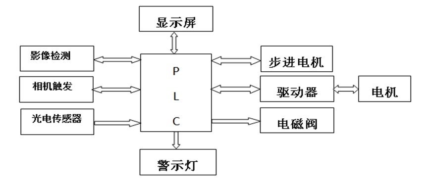 (2)顯示屏 操作人員與設(shè)備的交互對話窗口。通過與PLC實(shí)時(shí)通信,實(shí)現(xiàn)對設(shè)備工作參數(shù)的設(shè)定、運(yùn)行狀態(tài)的監(jiān)控顯示、檢測結(jié)果的實(shí)時(shí)輸出、圖像檢測狀態(tài)、數(shù)據(jù)統(tǒng)計(jì)顯示等功能。